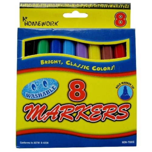 Broad Tip Watercolor Markers - 8 countWashable watercolor markers, long lasting inks. Safe non toxic, ASTMD approved.Color: Assorted colors8 markers per box, 48 boxes per case.