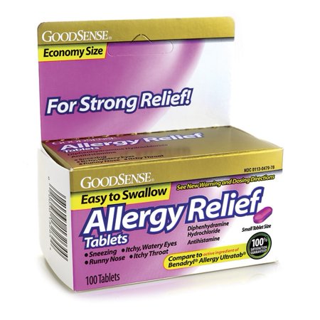 Easy to swallow Allergy Relief Tablets o Compare to Benadryl Allergy Ultratab o 100 tablets o o Good Sense Allergy Relief | 25 mg | 100 Tabs o Sold by Swanson Vitamins.