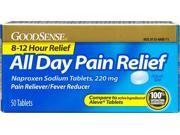 The active ingredient in GoodSense Naproxen Sodium Tablets 220 mg, All Day Pain Relief, is naproxen sodium 220 mg (naproxen 200 mg), a nonsteroidal anti-inflammatory drug (NSAID). Compare to Aleve Tablets active ingredient. Naproxen sodium may be used as a pain reliever/fever reducer for adults and children 12 years and over. Ailments like minor pain of arthritis, backache, headache, the common cold, muscular aches, menstrual cramps and toothache may interfere with your daily activities. So can stopping to take multiple doses of medicine. GoodSense Naproxen Sodium Tablets 220 mg, All Day Pain Relief, contains a pain reliever (NSAID) that lasts up to 12 hours with just one dose. GoodSense Naproxen Sodium Tablets 220 mg has strength to last 12 hours with a one-tablet dose. Pain relief that lasts all day lets you keep up with your life. Be at your best by relieving minor aches and pains due to minor pain of arthritis, muscular aches, backache, menstrual cramps, headache, toothache, and the common cold, and temporarily reduces fever. GoodSense Naproxen Sodium Tablets 220 mg, All Day Pain Relief, are gluten free.
