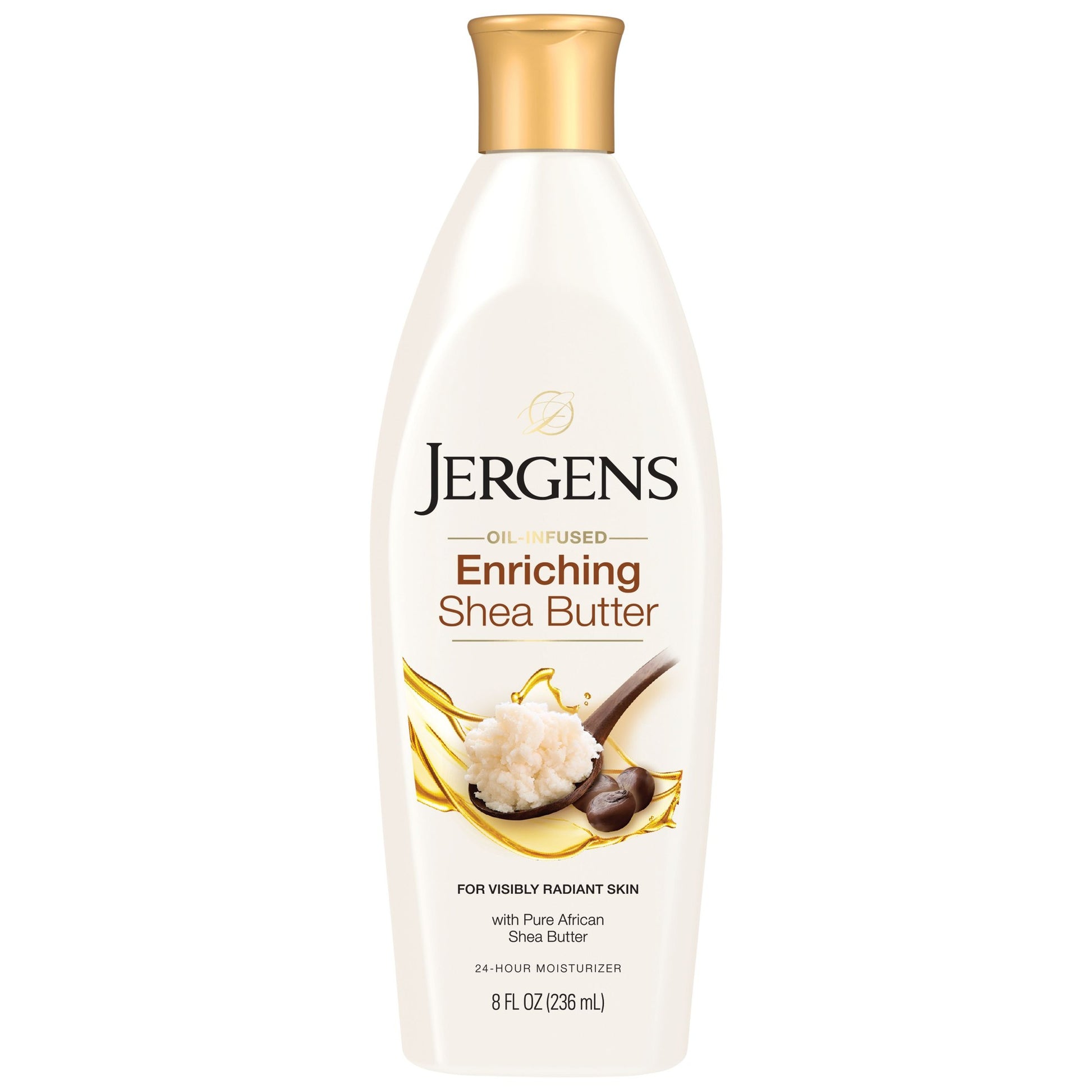 Shea yes to 2X more soft and supple feeling skin! Give your skin the deep conditioning moisture it needs with Jergens Enriching Shea Butter Body Lotion. This easy-to-spread shea butter lotion for dry skin smooths onto skin effortlessly and absorbs quickly. Worried about tacky skin? Don’t be! Jergens Enriching Shea Butter Lotion won’t leave your skin feeling greasy or sticky just soft and smooth. Formulated with naturally-derived African Shea Butter known for its restorative properties this body moisturizer delivers 2x more soft and supple feeling skin. It’s time to banish dullness and bring back your blingy radiance. Use it as your daily body and hand lotion for hydration that leaves a pleasant light and comforting scent and keeps your skin nourished. This formula with Jergens unique Hydralucence blend and with Vitamin E will leave your skin looking 2x more radiant and restored. If you are looking for a thoughtfully formulated option Jergens Enriching Shea Butter Body Lotion is vegan friendly and cruelty free. In addition to the environment we care about the quality of ingredients that touch your skin. That is why this dermatologist-tested vegan-friendly lotion for dry skin is free of artificial dyes and parabens. Ready for beautiful healthy-looking skin? Just apply generously and get ready for skin that feels silky smooth. Jergens Enriching Shea Butter Body Lotion your skin strikes oil and gets moisture rich. Cha ching! It’s that feel-good feeling of Jergens. Satisfaction Guarantee. Limitations may apply.