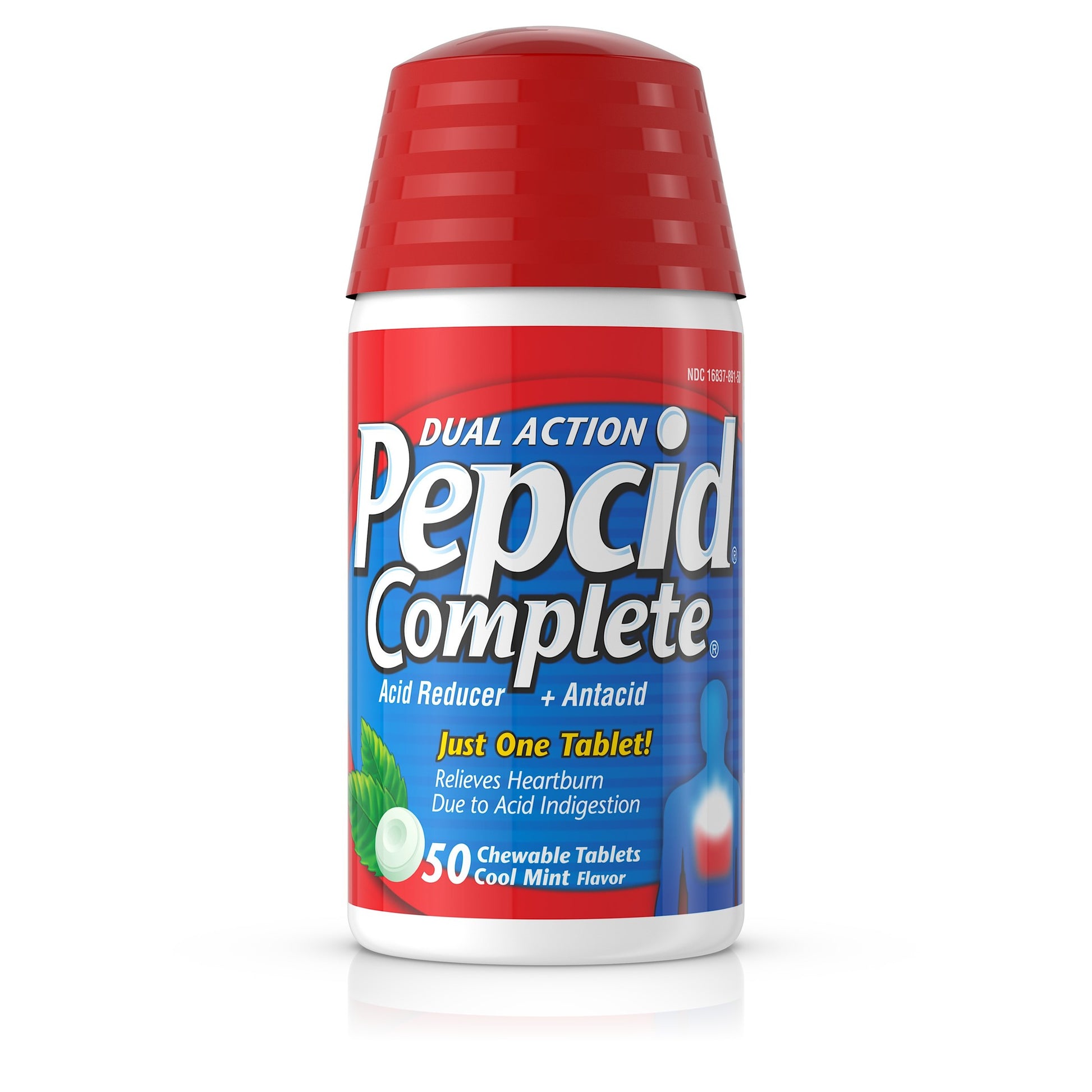 Quickly relieve heartburn & reduce acid associated with acid indigestion & sour stomach with Pepcid Complete Acid Reducer + Antacid Chewable Tablets. These mint flavored heartburn medicine + antacid chews combine a fast-working antacid & long-lasting acid reducer to help control acid all day or night.* Formulated with 10 mg of the acid reducer famotidine, 800 mg of the antacid calcium carbonate & 165 mg of the antacid magnesium hydroxide per tablet, this heartburn reliever helps to neutralize & control acid. The dual-action formula of these antacid chews starts working in seconds & lasts longer than Tums.* Whether at brunch or a new food spot, use Pepcid Complete Berry Chewables for fast-acting heartburn relief. * Based on 9-hour acid control studies during the day & 12-hour acid control studies during the night. Acid control does not imply symptom relief. Tums is a registered trademark of GlaxoSmithKline.