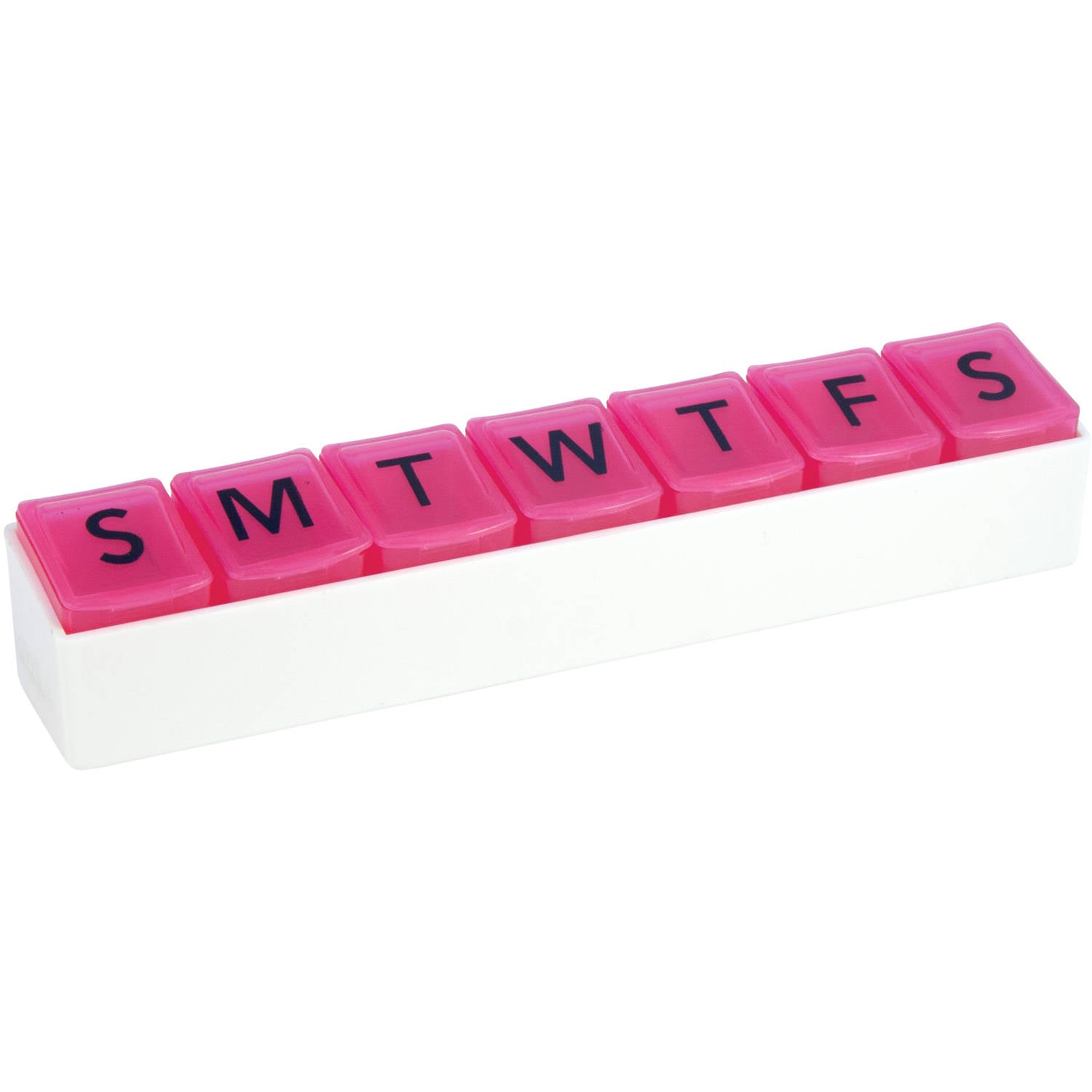 The Seven-Day Single Daily offers a new way to carry a weekly medication regimen. The tray securely holds 7 daily removable pill pods. Each daily pill pod can be easily removed and taken on the go. This product is perfect for individuals who want to take their pills or vitamins on the go in a secure and easy-to-carry compartment. Material: Plastic.