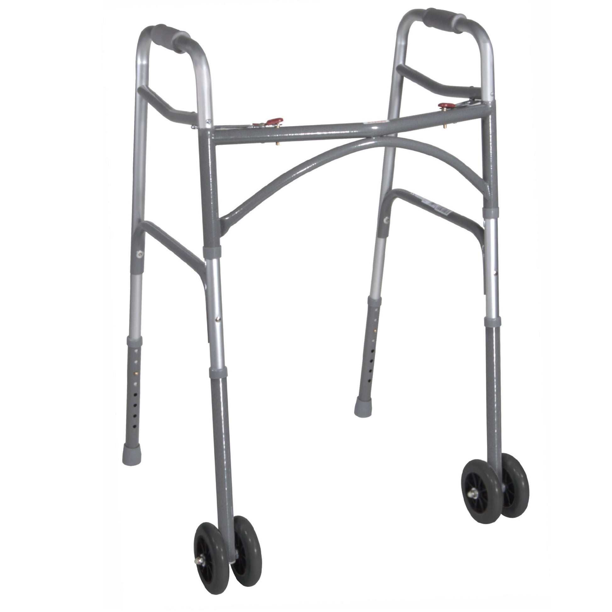 The Bariatric Aluminum Two Button Folding Walker with 5" dual front wheels by Drive Medical now comes in a wider and deeper frame designed to accommodate individuals up to 500 pounds. The precision design provides additional strength while adding minimal weight to the walker. The "U" brace, steel legs and side brace ensure security and stability. The 5" dual front wheels provide a smooth walk and negate the need to pick up the walker with each step. Features and Benefits: For bariatric useSteel legs and side bracesDurable 5" dual front wheelsPrecision design provides additional strength while adding minimal weightWider and deeper frame design accommodates individuals up to 500 lbsEasy push-button mechanisms may be operated by fingers, palms, or side of handEach side operates independently to allow easy movement through narrow spaces and greater stability while standingVinyl-contoured hand gripWeight Capacity: 500 lbsWarranty: Limited Lifetime.
